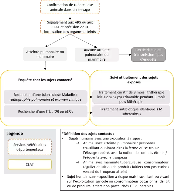 - Direction départementale en charge de la protection des populations (DDecPP) : communiquer au Service de santé au travail (SST) de la MSA et au CLAT tout cas animal de tuberculose à M. bovis pour déclencher l’enquête d’entourage des humains exposés.